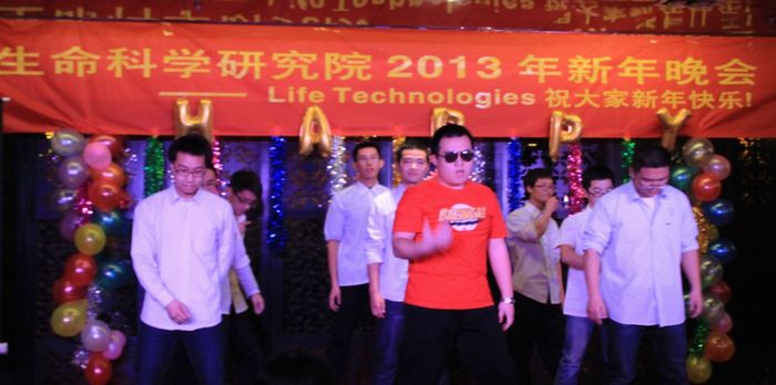 晚上6点,伴随着有力的节奏声,开场舞《江南style》点燃了全场的激情。简单的衣着,动感的舞步,充满激情的表演,9位男生的精彩舞蹈让欢呼声响彻全场。 美妙的舞蹈过后,四位主持人高举酒杯与全院在座的100多位师生共饮,表达最衷心的祝愿与美好的祝福。与此同时,生命科学研究院2013年新年晚会正式揭开神秘的面纱。