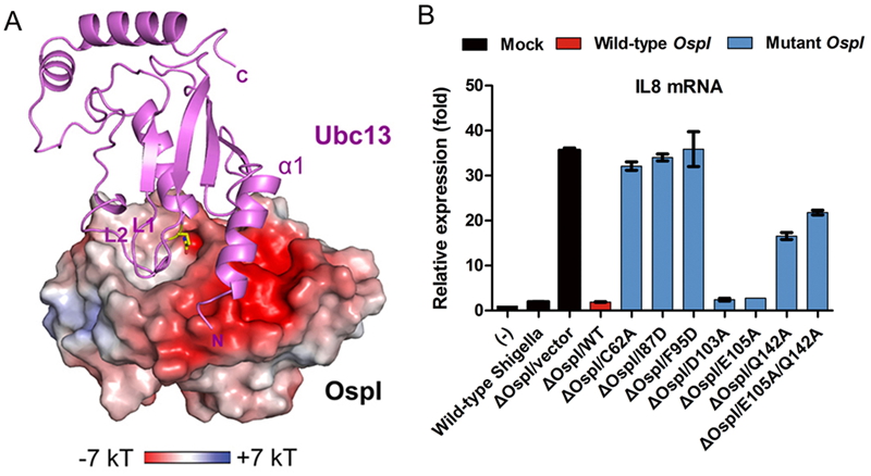 痢疾杆菌是一种能够侵入肠上皮细胞、并引起人类痢疾病的致病菌,它能够通过一个独特的三型分泌系统,将其毒性效应蛋白注射到宿主细胞中,分泌到宿主细胞中的效应蛋白能够作用于宿主细胞的关键信号分子,调节宿主细胞的信号通路,以利于痢疾杆菌在宿主细胞内的生存和大量繁殖,从而导致具有腹泻、溃疡、肠炎等严重病症的人类痢疾病。OspI是痢疾杆菌一个重要的效应蛋白,能够特异地作用于宿主细胞中重要的泛素结合酶Ubc13,并将其第100位天冬酰胺脱酰胺化,使之失活,从而抑制宿主细胞的NF-kB天然免疫信号通路。然而,OspI如何识别Ubc13以及如何催化脱酰胺化反应的分子机制并不清楚。