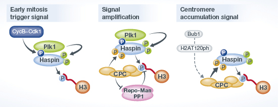 有丝分裂期染色体分离的异常与癌症密切相关。在长期的进化历程中细胞学会了运用一套精细的调控机制来保证有丝分裂的高保真性。由蛋白激酶Haspin所介导的组蛋白H3三号位苏氨酸的磷酸化(H3T3ph)能招募染色体乘客复合体(Chromosomal Passenger Complex, CPC)至染色体的着丝粒区,并通过CPC的激酶组分Aurora B促进染色体的精确分离。Haspin在有丝分裂期的激活机制是亟待解决的重要问题。