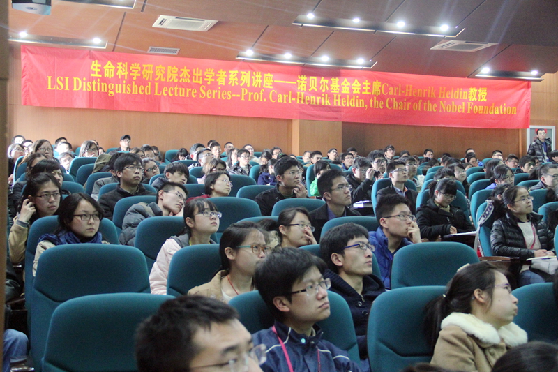 13日下午的学术讲座师生积极踊跃,可容纳300余位的报告厅座无虚席,还有不少听众倚墙而站或席地而坐。Carl-Henrik Heldin教授做了题为“TGF-β Signaling via Smad and non-Smad Pathways”的学术报告,主要介绍了TGF-β信号通路在癌症早期发生和癌症晚期转移中的功能和作用,分别报告了经典的Smad转录调控促进上皮细胞间充质化和非Smad介导的TGF-β受体I的被切割入核调控癌症转移的调控机制,并介绍了相关领域的重大科学问题和最新进展。提问环节,师生们围绕TGF-β与Carl-Henrik Heldin教授进行了热烈讨论和深入交流。
