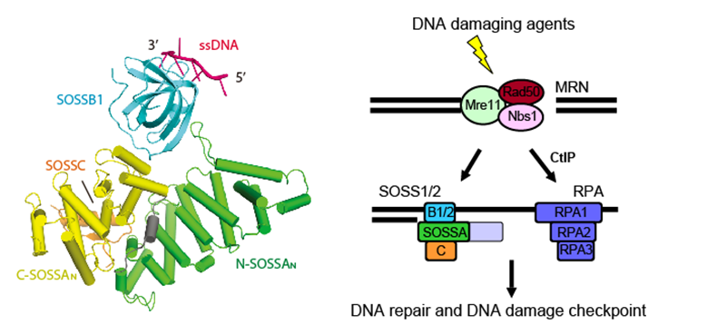 最新研究发现单链 DNA 结合蛋白 SOSSB1和 SOSSB2,可通过与 SOSSA 和 SOSSC 分别形成 SOSS1 和 SOSS2 复合体,参与 DSB修复。我们通过一系列结构生物学实验也表明:SOSSA作为支架蛋白介导了复合体的组装及稳定性的维持,而SOSSB则是ssDNA识别的关键组分,它利用不同的蛋白表面参与SOSS复合体的装配和ssDNA的结合。同时,进一步的突变实验也很好的验证了其在DSB修复中的重要作用。