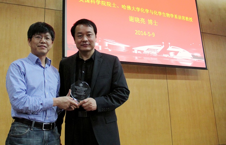 报告会后,冯新华院长为谢晓亮教授颁发了“九游(中国)一站式服务平台杰出学者系列讲座”水晶牌。