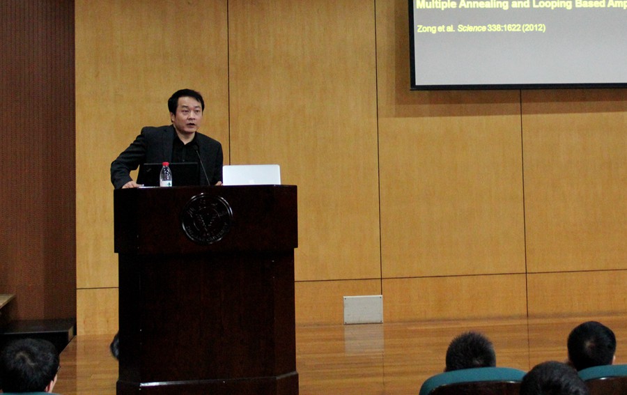 在报告会上,谢晓亮教授作了题为“Life at the Single Molecule Level: from Single Molecule Enzymology to Single Cell Genomics“的学术讲座,从技术层面主要介绍了单个酶分子的酶促反应以及人类基因组测序,并介绍了其研究领域对人类健康影响的重大科学进展和最新研究发现。