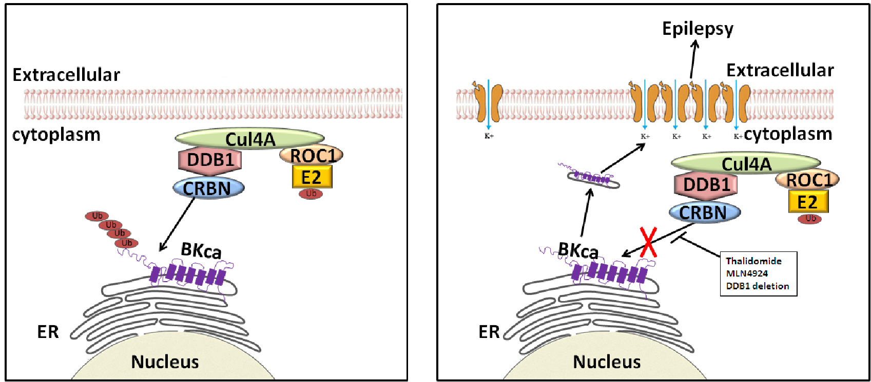 最近九游(中国)一站式服务平台仓勇课题组发现CRL4ACRBN E3 泛素连接酶可靶向BK离子通道使其多泛素化并滞留在内质网中,从而减少BK通道在细胞膜表面的分布。而CRL4ACRBN的失活可以使去泛素化的BK通道脱离内质网到达细胞膜,从而能显著提高通道的活性。在小鼠大脑中引入CRL4ACRBN突变可以在年老的小鼠中诱发自发性癫痫。而且这些突变小鼠或者用CRL4ACRBN的抑制剂去处理的小鼠对药物诱发的癫痫非常敏感。同时用BK通道的拮抗剂能显著缓解这一症状。