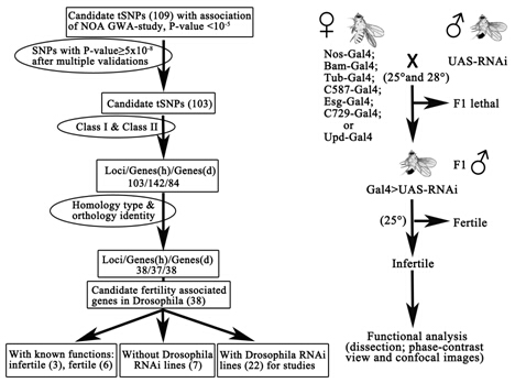 非梗阻性无精症(non-obstructive azoospermia)是一种严重的男性不育症,其发病的分子机制仍不清楚。全基因组关联研究(GWAS)的发展使我们可以通过单核苷酸多态性(SNP)找到疾病相关的致病基因。但是由于人群的异质性和对样本的需求量过大,GWAS往往只能发现极个别高度关联的SNP,因此极大的限制了GWAS的应用。在本研究中,佟超课题组利用模式动物果蝇对人类无精症 GWAS筛选出的候选SNP进行生物学验证,发现了一些统计学上关联度不高的SNP也可以是功能性SNP。这一研究不但发现了7个与人类无精症相关的新基因,加深了人们对这一疾病的了解,而且也为利用GWAS数据研究人类疾病提供了一个新的模式。