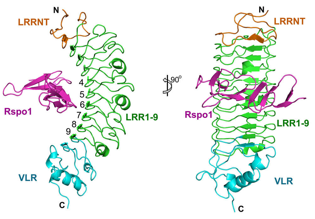 富含亮氨酸基序的G蛋白偶联受体(LGRs)是一类在高等生物胚胎发育,器官发生以及干细胞维持中非常重要和保守的GPCR受体,它们能通过胞外结构域来识别配体分子从而激活细胞内的下游信号通路。LGRs受体从序列特征可分为A型(LGR1-3),B型(LGR4-6)和C型(LGR7-8)。其中A型和C型LGR受体和配体的识别机制在过去的十几年时间已经得到很详尽的研究,唯有B型LGR受体和配体的机制人们还不清楚。为了解决这个重要的生物学问题,朱永群实验室使用昆虫细胞培养技术并结合亮氨酸基序嵌合技术成功获得了B型LGR4受体以及其与配体Rspo1复合物的晶体,并解析了它们的三维结构。通过对结构的深入解析,研究人员发现LGR4的胞外结构域为典型的半个马鞍状结构,而Rspo1主要通过其串联的两个富含半胱氨酸的Cysteine-rich domain结合到LGR4马鞍状结构的内表面,这种相互作用是通过LGR4的两个不同电荷面来介导的。研究人员还鉴定出LGR4以及Rspo1上参与相互作用的重要氨基酸残基,并且通过对序列的比对,发现参与相互作用的大部分氨基酸残基在LGR4-6以及R-spindin家族中都是高度保守的,从而证明B型LGR受体家族对R-spondin蛋白的识别保守性。研究人员通过对现有的A、B、C型LGR家族蛋白与配体复合物的结构对比,发现不同类型的LGR受体识别配体的分子机制存在很大的不同,正是这种多样化的识别机制丰富了LGR受体在生物体内的功能。