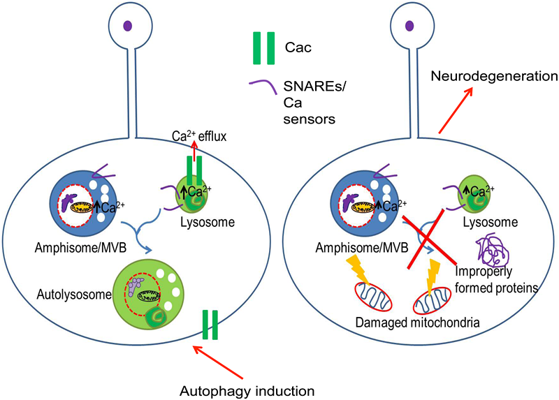 在一个旨在获得能导致神经系统功能异常突变的大规模遗传筛选中,作者发现编码VGCC亚基的cacophony基因的突变果蝇感光神经元终端逐渐积累了大量自噬泡,并且最终导致了神经元终端和周围神经胶质细胞的退行性变化。实验结果提示自噬泡与溶酶体之间的融合过程存在障碍。为了检测VGCC是否在哺乳动物中发挥相似的功能,作者又对编码VGCC不同亚基的基因Cacna1a和Cacna2d2的突变小鼠进行了研究,发现这些突变都会导致小鼠小脑出现自噬障碍,与细胞自噬相关基因神经特异性敲除小鼠的表型非常类似。他们还进一步发现VGCC的亚基CACNA1A定位于溶酶体上,其钙离子通道活性是溶酶体膜融合过程所必需的。