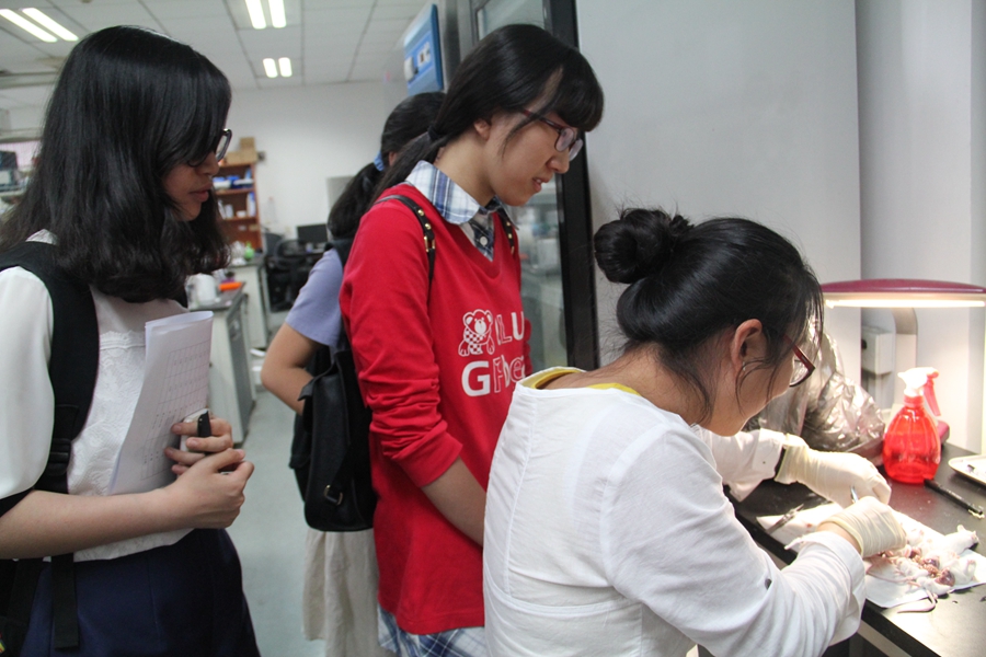参观者们对实验室的研究背景、仪器设备、实验操作等都表现出了极大的兴趣和好奇心,虽然已经到了参观下一个实验室的时间,却迟迟不愿离开,仿佛通过显微镜、通过离心管、通过实验者的双手,他们看到了一个从未看到过的精彩世界。值得一提的是,以小鼠和果蝇为模式动物的实验室引起了在场各年级学生,特别是初、高中生的极大兴趣,原本拘谨的他们也忍不住驻足观察,积极地与研究生们交流,获得了课本上学不到的知识和灵感。“我非常喜欢生物领域,志向将来也从事科研,这次深深感受到了科研的精神,开拓了眼界,更加坚定了我的决心。”一名高中生充满稚气的脸上闪耀着光芒。参观者们对讲解员们通俗易懂、有趣生动的讲解以及熟练的实验操作钦佩不已,他们主动地邀请讲解员参加后续的“Happy Hour”活动继续交流,讲解员们面对求知好学的学弟学妹们也欣然答应。