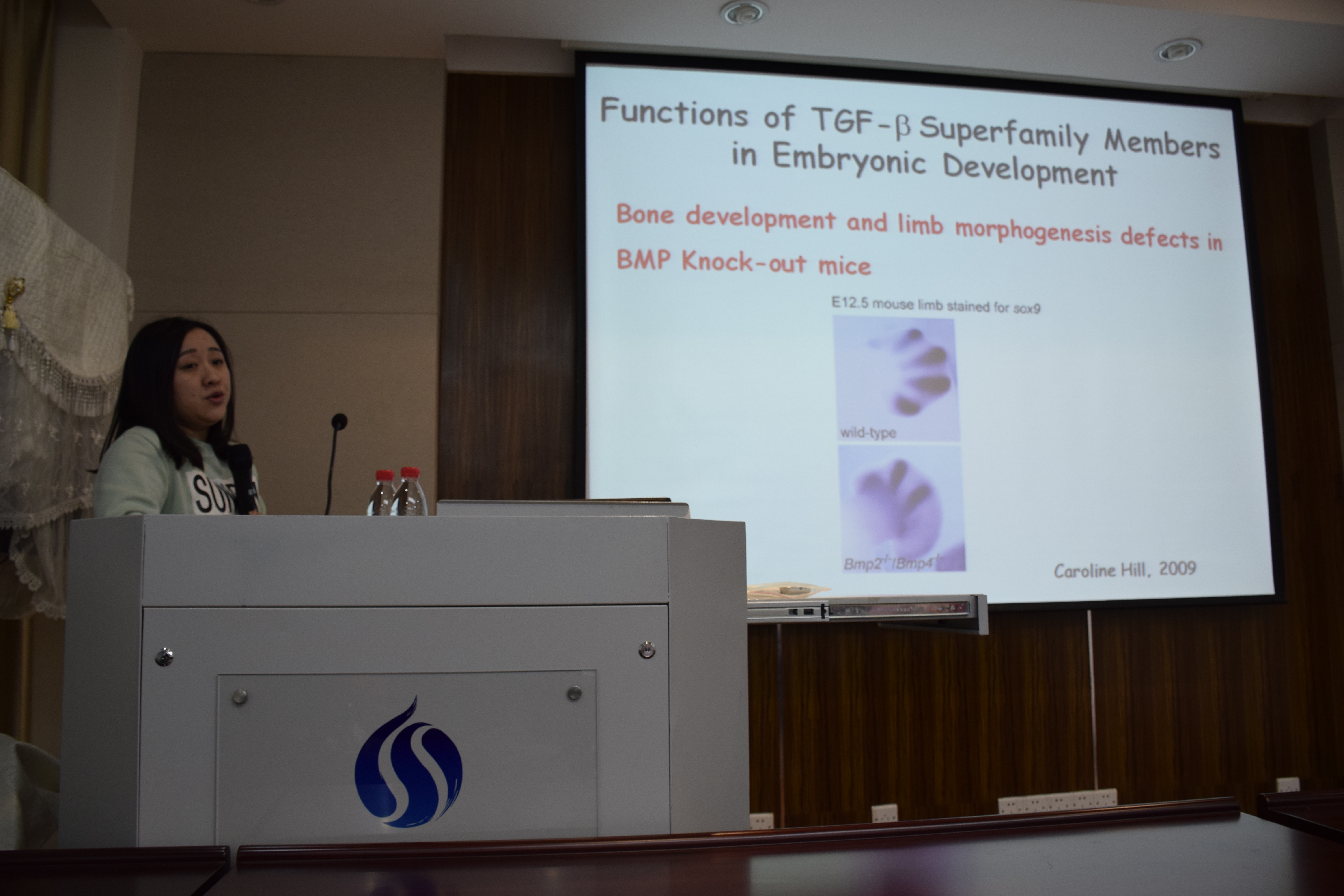 陈芬芳首先为大家带来了主题为“Exploring the Fatastic TGF-β Signal World”的精彩报告,依次从TGF-β 信号通路的发现、功能、调节等多个方面进行介绍,并基于所发表的论文重点讲解了TGF-β 在胚胎发育与癌症中的重要作用以及有关TGF-β 超家族成员BMP的研究成果。陈芬芳通过深入浅出的讲解为大家呈现了TGF-β研究领域的独特魅力,同时她清晰流畅的表达思路和严谨求实的研究态度深深感染了在场的同学。