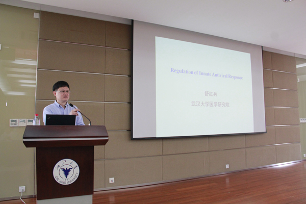 访问当日,舒红兵院士在冯新华院长的陪同下参观了生研院,高度评价了研究院建院六年来所取得的突出成绩。随后,作为“生命科学研究院杰出学者系列讲座 (Life Sciences Institute Distinguished Lecture Series )”2016年第2场(总第17讲)讲座嘉宾,舒红兵院士为全校师生作了题为“抗病毒天然免疫机制”的精彩学术报告。