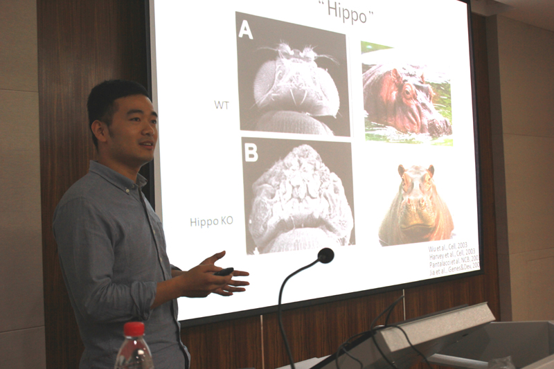 代晓明首先为大家作了一场主题为“Walk into the world of Hippo”的精彩报告,通过对Hippo信号通路的背景介绍,让大家对这个领域的研究有基本的了解。并结合他已发表的论文,为大家讲述了他的两个研究课题。其间,他以自身的经历告诉大家,并不是每一次的实验都能获得结果,我们需要以此引发自己的思考,在实验熟悉的基础下,逐步分析每一步实验来得出解决方案。同时,他也讲述了自己在投文章时遇到的各种挫折和失败经历,他表示,遇到困难时,我们更需要坚持下去。正是他这种坚持不懈的精神,才能最后获得科研上的成功。他清晰流畅的表达思路,略带诙谐的表达方式和严谨求实的研究态度,感染了在场的每一位同学。
