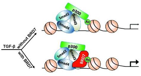 | BRD7从两方面增强TGF-β信号通路:1)BRD7通过其与酰基化组蛋白及Smad蛋白的相互作用促进Smad蛋白复合物与DNA的结合;2)BRD7通过与p300的相互作用促进Smad蛋白复合物的转录活性。 |