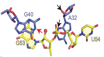| Pistol核酶三维空间结构 | Pistol核酶催化中心构象 |