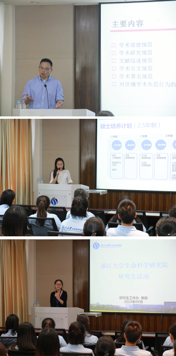 随后,仓勇老师对全体研究生新生进行了专题学术规范培训,强调了端正科研态度和严守学术规范的重要性。研究生办公室赵子云老师对于2016级研究生培养计划进行了详尽的解读;研究生办公室黄莉老师仔细讲解了生研院的思政工作。各个环节的介绍让新生从全方面了解未来学习生活中所需要完成的工作,以及作为一名科研工作者应有的素养,为日后的科研学习奠定了基础。