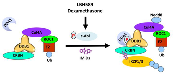 IMiDs (immunomodulatory drugs)是临床上治疗多发性骨髓瘤的一类药物,包括沙利度胺,来那度胺和泊马度胺。IMiDs可以结合泛素连接酶Cullin Ring Ligase 4 (CRL4)的底物受体CRBN蛋白,促进两个转录因子IKZF1和IKZF3被CRL4CRBN泛素连接酶招募进而泛素化。泛素化的IKZF1和IKZF3进入蛋白酶体降解,导致骨髓瘤细胞毒性。在临床治疗中,来那度胺常和其它药物联合使用来获得更好的效果,比如来那度胺与地塞米松(dexamethasone)或帕比司他(panobinostat或LBH589)联合使用。然而,联合使用的分子机制尚不清楚。