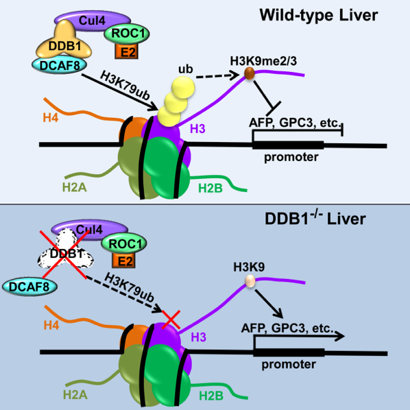出生后的肝脏中,一系列在胚胎时期高表达的基因,例如AFP(α-fetoprotein,α-甲胎蛋白), GPC3, H19等,会被迅速下调。仓勇课题组以此为切入点,利用转基因小鼠为模型,发现在此过程中,肝细胞内组蛋白H3的泛素化会逐渐增强直至趋于稳定。敲除组蛋白H3的泛素连接酶CRL4,则能够重新激活原本被抑制表达的基因。更进一步的研究发现了组蛋白H3被CRL4泛素化所需要的接头蛋白(DCAF8)和泛素化发生的位点(H3K79)。通过染色质免疫共沉淀技术,该课题组证明,组蛋白H3泛素化很可能通过增强靶基因启动子区域的H3K9的甲基化水平抑制基因表达的。此项研究不仅解释了肝脏出生后的发育调控机制,而且AFP作为目前临床最常用的肝癌生物标记蛋白,对其表达调控也有利于对于肝癌病患的诊断,具有很深的临床借鉴意义。