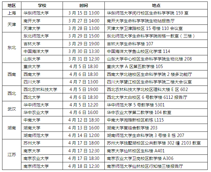 生命科学研究院将于3月中旬至4月中旬在全国各地多所高校进行招生宣讲,为有意向读研的本科同学们提供深入了解研究院以及同导师面对面交流的平台,欢迎携带个人简历参加。