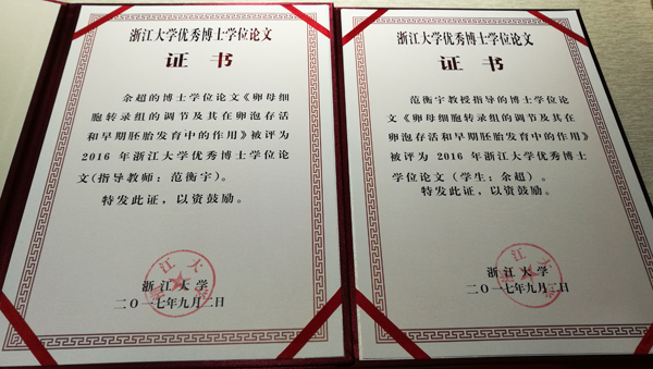 日前,浙江大学公布了2016年优秀博士学位论文评选结果,生命科学研究院范衡宇教授指导、余超博士完成的学位论文《卵母细胞转录组的调节及其在卵泡存活和早期胚胎发育中的作用》获选。颁奖仪式于2017年9月17日在紫金港校区体育馆举行,范衡宇教授上台领奖。
