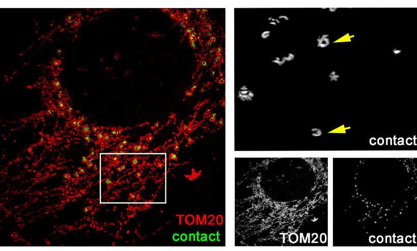 超高分辨率显微镜下的荧光图,绿色荧光是reporter指示的内质网线粒体接触点,红色荧光是线粒体