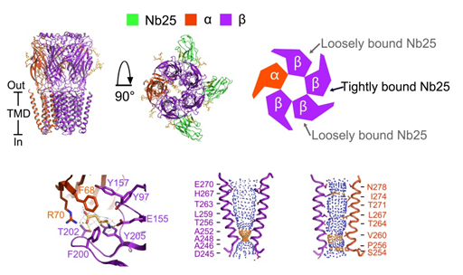 GABAA受体属于Cys-loop配体门控离子通道超家族的异源五聚体,共有19个亚基(a1-6,b1-3,g1-3,d, e, q, p, r1-3)。不同亚基的组成和排列使得神经元上存在大量具有不同的生物物理学和药理学性质GABAA受体。尽管在过去二十年对GABAA受体亚基的排列组合进行了大量的研究,但是受体亚基的排列原理依然未知。2014年,同源五聚的GABAA受体结构第一次得到解析,揭示了GABAA受体处于脱敏状态下的构象(Miller &Aricescu, Nature, 2014)。然而,由于GABA是结合在b亚基和a亚基的相互作用面从而引起GABAA受体开放,因此,GABA如何选择性地结合、以及这个结合如何激活配体门控氯离子通道的机制至今仍然不清楚,需要异源五聚的GABAA受体结构才能够回答这些问题。