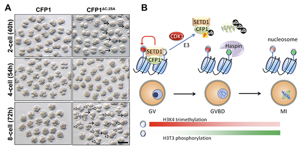 在该研究中,课题组也首次发现,CFP1蛋白自身也受到细胞周期的紧密调控。当卵母细胞恢复减数分裂的2小时内CFP1就迅速发生泛素化降解;与此同时,细胞周期引擎激酶CDK1介导CFP1发生磷酸化修饰,降低了CFP1与组蛋白H3的结合能力。在磷酸化和泛素化的双重抑制作用下,迅速清除了与染色质结合的CFP1,并降低了基因组中的H3K4me3水平,从而使染色质能够排除上述蛋白造成的位阻效应,有效进行凝集。如果在卵母细胞中过表达不能降解、不能磷酸化的持续激活型CFP1,也会造成卵母细胞减数分裂和受精卵有丝分裂的紊乱,证明CFP1的双重抑制性调控具有重要的生理意义。进而研究者把这一观察延伸到体细胞中,在HeLa细胞中也观察到CFP1随着细胞进入分裂期而被降解清除、在退出有丝分裂后重新积累的现象,说明每一次细胞分裂都伴随着SETD1-CFP1复合体在整个基因组上重新定位、每一个细胞周期都是一个表观遗传修饰“重新洗牌”的过程,对今后的相关研究提供了一些概念性的思考。