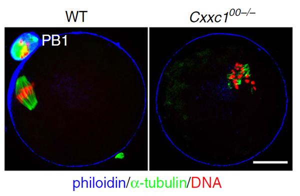 Cxxc1基因敲除的卵母细胞具有减数分裂缺陷:纺锤体组装和染色体排列异常,不能排出第一极体(PB1)