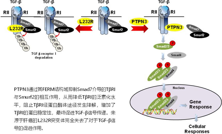 袁博(第一作者)和同事发现了一个新的TGF-β信号调控因子,即蛋白质酪氨酸磷酸酶3(Protein Tyrosine Phosphatase Non-receptor 3, PTPN3)。PTPN3在肝内胆管癌中发生突变,属于抑癌基因产物,但是它的抑癌分子机制并不清楚。我们的研究表明,PTPN3能够通过阻断E3泛素连接酶Smad7/Smurf2对I型TGF-β受体(TβRI)的降解,从而提高TβRI的稳定性,促进TGF-β受体下游的信号传递和靶基因转录响应。因此,PTPN3能够增强TGF-β对细胞增殖和肿瘤发生的抑制作用。尽管PTPN3是一个蛋白质酪氨酸磷酸酶,但是它对TGF-β信号的促进作用并不依赖于PTPN3的磷酸酶活性。有趣的是,PTPN3在肝内胆管癌中的高频突变体L232R完全丧失了对TGF-β抑癌信号的促进作用,从而促进肝内胆管癌的发生发展。