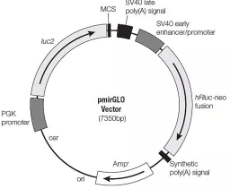 2. 两种荧光素酶位于同一个载体上。这样偏差更小,毕竟转染一个质粒比转染两个质粒要容易,在这方面,根据检索到的资料显示,现在的这类质粒比较有名的是Promega公司的pmirGLO质粒。