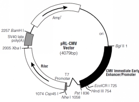(2)pRL系列载体(以pRL-CMV为例),pRL系列载体可在哺乳动物细胞中组成型地表达海肾荧光素酶。
