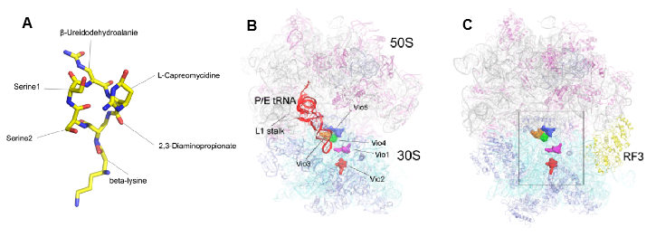 A. Viomycin的结构;B. Viomycin与核糖体复合物的冷冻电镜结构(3.8埃);C.Viomycin与核糖体复合物的晶体结构(3.1埃)