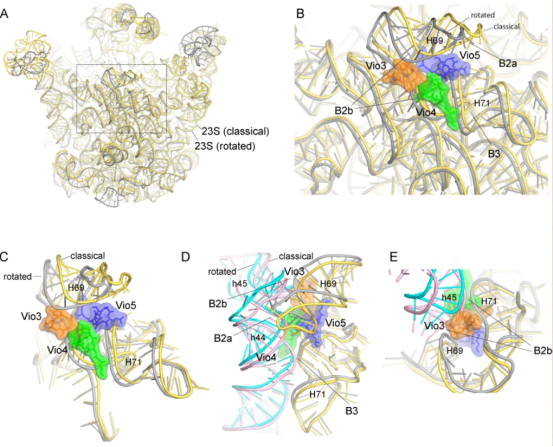 因此,最重要的科学问题是Viomycin如何诱导核糖体发生大规模构象变化及如何将核糖体稳定在杂合状态。为了解决这个问题,我们捕获并解析了Viomycin-核糖体复合物在非经典态(hybrid-state)的cryo-EM(图1B)和X-ray高分辨率结构(图1C),揭示了Viomycin在核糖体上新的结合位点和作用方式(图2)。