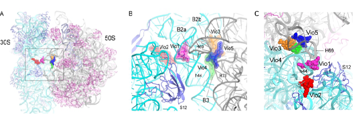 以往研究表明,Viomycin能够抑制核糖体移位(translocation)以及70S核糖体亚基的解离。在移位期间,mRNA和tRNA同时移动位置并伴随着核糖体大规模的构象变化,包括30S亚基及其头部结构域(head domain)的旋转。荧光共振能量转移(FRET)和化学印记实验已证明Viomycin结合核糖体后可以将其捕获到类似移位过程中的杂合中间态状态(hybrid state),然而这其中的机制还不明确。
