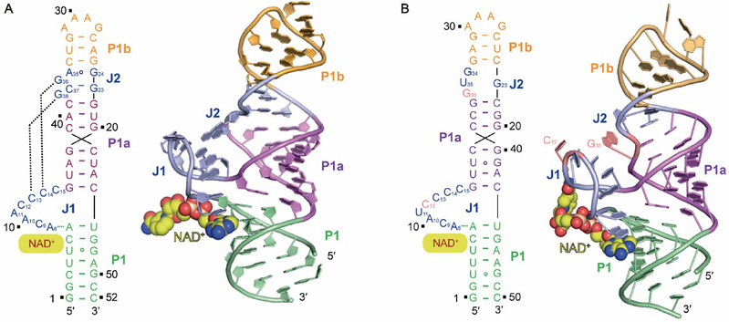 (A) NAD+核开关Domain1结合NAD+的复合物结构; (B) NAD+核开关Domain1结合NAD+的复合物结构。