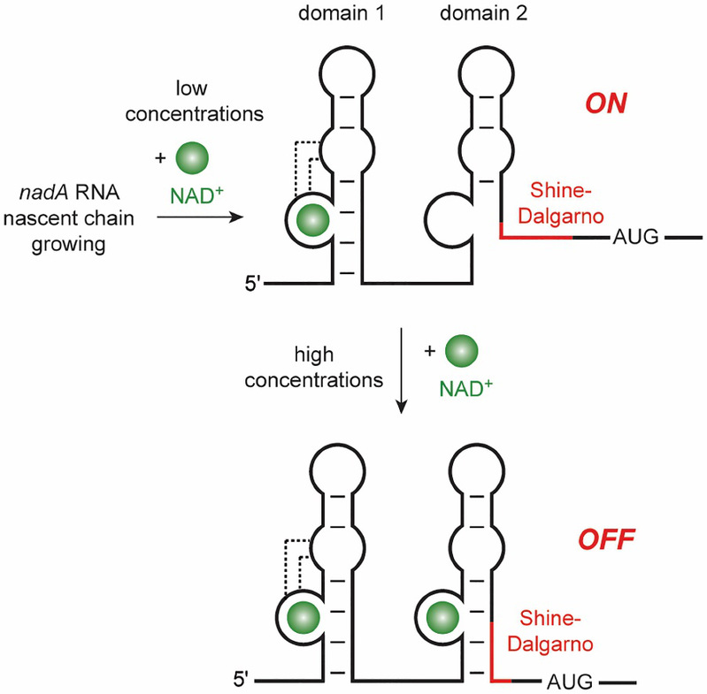 烟酰胺腺嘌呤二核苷酸(NAD, Nicotinamide Adenine Dinucleotide),是生物体内的一类重要代谢物,其氧化形式为NAD+,还原形式为NADH。因为良好的电子转移特性,NAD+作为辅酶因子参与细胞内很多重要的氧化还原反应。2019年耶鲁大学的Ronald Breaker教授课题组在nadA基因上游发现了一类保守的能够特异性识别NAD+的RNA结构域,即nadA结构域,也称为NAD+核开关【1】。与其他核开关不同的是,NAD+核开关包含有两个串联的序列相近的独立结构单元Domain1和Domain 2,序列分析表明调控基因表达的表达平台变构序列(SD序列)位于Domain2中,而体外结合实验却发现只有Domain1能够识别NAD+。因而,Domain1与Domain2如何通过与NAD+相互作用调控nadA基因的表达,进而调控NAD+的代谢等这些在新型核开关研究中出现的新问题急需进一步阐明。