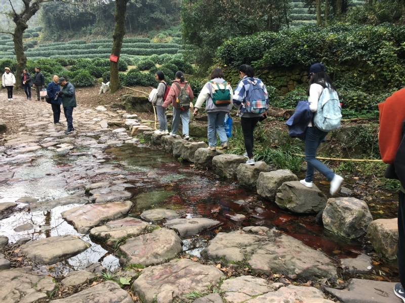 淡淡幽香飘草舍,清茶慢饮就芬芳。刚过正午,毅行大队便来到了龙井山庄。置身茶园之内,放眼望去都是清爽的绿景,茶园深处有洁白的茶花还在盛开,空气中弥漫着茶叶的香甜。行走在茶垄中,大家都不觉得放慢了脚步,享受这一刻的惬意轻松。