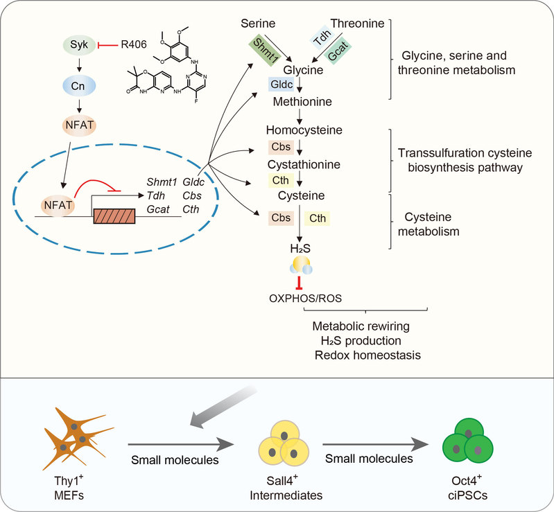 进一步开展机制研究,发现R406通过抑制Syk-Ca2+-Cn-NFAT信号通路发挥作用;通过转录组测序,发现R406显著促进丝氨酸-甘氨酸-苏氨酸代谢轴中的关键基因表达;CUT&Tag等实验表明,NFAT是这些基因的直接上游抑制因子;进一步通过代谢组学分析,揭示R406可以提高丝氨酸-甘氨酸-苏氨酸代谢、转硫途径及半胱氨酸代谢的关键代谢物水平;R406处理后,半胱氨酸代谢产物硫化氢(H2S)水平显著上升;非常有意思的是,硫化氢可以调控化学重编程。