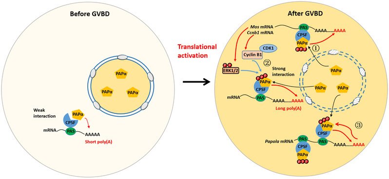 在本研究中,该团队首先证实,在小鼠基因组所编码的多个PAP中,PAPα在卵母细胞中表达水平最高,并且在生发泡(卵母细胞的细胞核)和卵胞质中均有分布。在小鼠卵母细胞中抑制PAPα活性,会阻断关键母源mRNA加poly(A)尾,使其不能发生翻译激活,造成减数分裂缺陷;而过表达PAPα,则会诱导卵母细胞提前启动减数分裂成熟过程。研究团队还发现,PAPα蛋白在减数分裂成熟过程中,有三个丝氨酸残基发生了磷酸化;与减数分裂密切相关的ERK1/2和CDK1是催化这些位点发生磷酸化的蛋白激酶;磷酸化修饰后的PAPα,与调控mRNA加尾的多亚基蛋白复合体CPSF(cleavage and polyadenylation-specific factor)结合更加紧密,因此具有更高的催化活性。此外,研究团队通过分析PAPα的表达模式发现,PAPα蛋白水平在卵母细胞成熟过程中不断增加,因为编码PAPα蛋白的mRNA 3’-UTR中也具有多个翻译调控元件,包括CPSF的结合元件,能够在PAPα催化下发生poly(A)尾的延长,伴随减数分裂恢复而发生翻译激活。