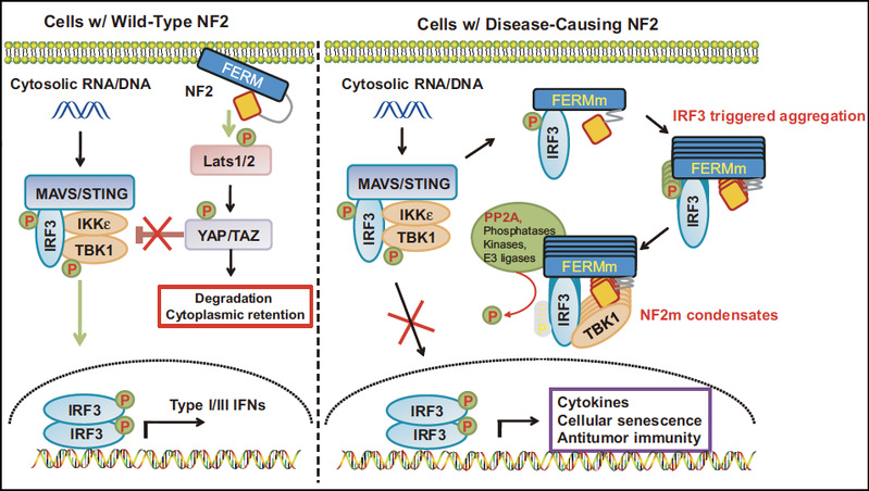 实验室初研究发现,NF2 通过影响YAP活性正向调控细胞的天然免疫应答。进一步研究发现,来自病人的NF2 FERM结构域的点突变体(NF2m可以强烈抑制核酸识别。更有意思的是,核酸识别激活后,活化的IRF3 可以诱导NF2m形成液滴状聚集体。NF2m 聚集体招募核酸识别主要信号蛋白 TBK1IRF3以及多种活性蛋白,包括蛋白磷酸酶PP2A,导致TBK1去磷酸化失活,从而强烈抑制天然免疫信号。功能上,NF2m强烈抑制cGAS-STING介导的细胞自主和非自主的肿瘤免疫,并能够 II 型神经纤维瘤病人的样本清晰检测到NF2m-IRF3凝集体