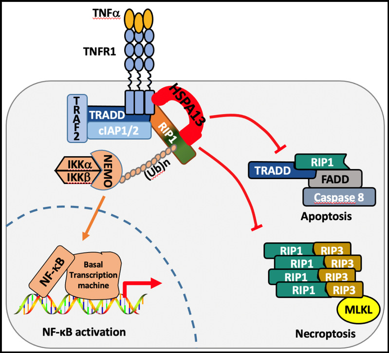 细胞因子TNFa结合受体TNFR1后,激活的TNFR1招募多种接头蛋白迅速组装形成锚定在细胞膜的复合体I。而其中HSPA13直接结合TNFR1与RIP1,作为支架蛋白稳定复合体I,促进NF-kB信号的转录激活;同时,HSPA13限制了RIP1的胞质活化,阻断胞质内的复合体IIa/b组装,抑制细胞凋亡及坏死。