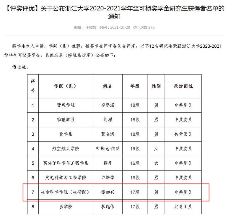 10月20日,浙江大学公布2020-2021学年竺可桢奖学金研究生获得者名单,我院在读博士研究生谭加兴入选。竺可桢奖学金作为浙江大学学生最高荣誉奖学金,每年从全校范围内遴选出12名科研能力强、综合素质高的研究生,获得者将载入学校年鉴。
