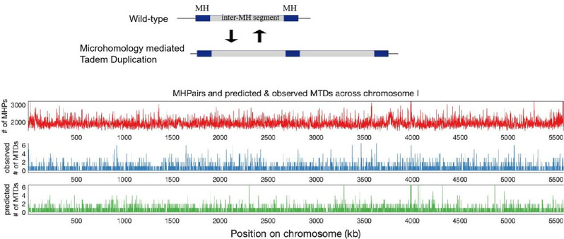本工作在裂殖酵母S.pombe中首次发现,单一DNA短片段可以较高频率自发形成首尾连接的串联重复,而串联重复可以更高频率回复到单一片段。发生可逆重复的短片段,且其唯一的序列特征是:两端具有4-10bp微型同源臂序列(Microhomology-pair)。 我们称这一现象为Microhomology mediated short segment Tandem Duplication,简称为MTD。进一步的研究表明,裂殖酵母基因组中具有微型同源臂的DNA片段广泛存在,为MTD突变类型的发生提供了海量的潜在位点。我们运用超高深度(覆盖10000倍)全基因组测序分析,仅在一个单克隆起源的细胞群体中即检测到近6000个位点发生MTD。实验证据显示,在ssp1基因位点上的MTD突变,使细胞具有可逆的抗药性,可在高浓度雷帕霉素条件下生长,表明MTD具有产生可逆的遗传多样性的生物功能,可以有助于生物群体适应外界环境的波动变化。