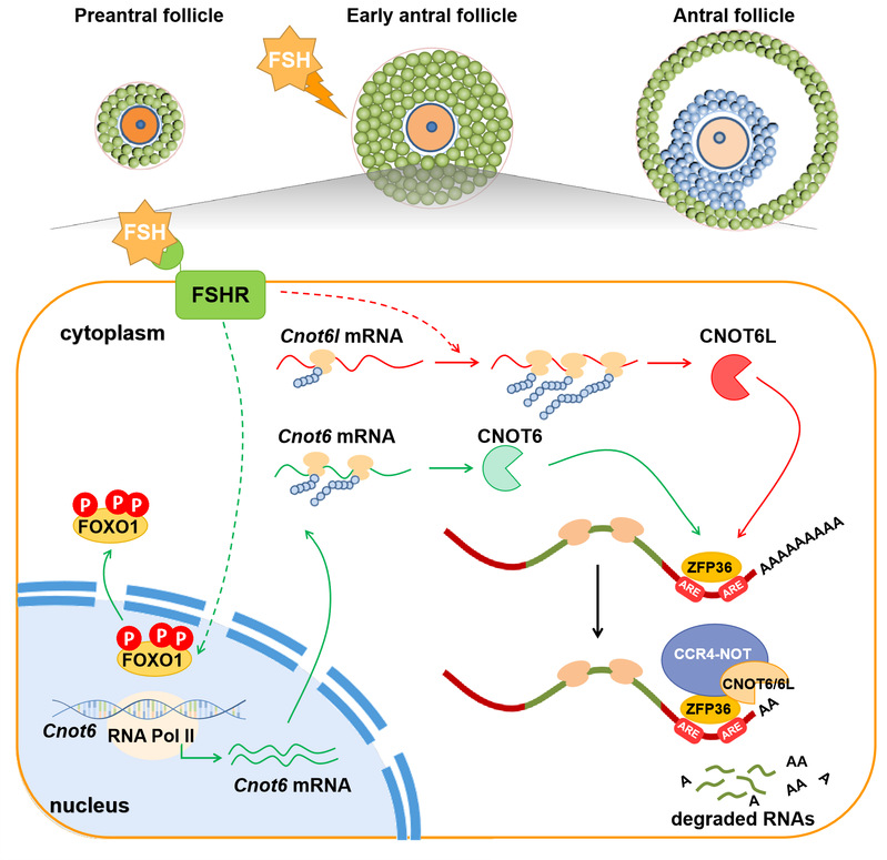 本研究通过构建Cnot6/6l双敲除的小鼠,明确CNOT6/6L亚基并不影响小鼠存活,仅专性影响雌性生殖发育。Cnot6/6l全敲的雌鼠完全不育,其发情周期紊乱、存在排卵障碍,而这些生理过程正是受垂体所泌促性腺激素FSHfollicle-stimulating hormone)调控的。课题组进一步研究发现,卵巢颗粒细胞中CNOT6/6LFSH下游的效应因子;FSH经由PI3K信号通路,诱导Cnot6/6l的转录、促进CNOT6L的翻译,使CNOT6/6L蛋白积累。同时,在小鼠卵泡生长过程中,FSH调控了大量编码卵泡生长、内分泌相关抑制因子的转录本降解,而这一过程是由CNOT6/6L介导的,使腔前卵泡发育成为有腔卵泡,为卵母细胞发育成熟提供了先决条件。