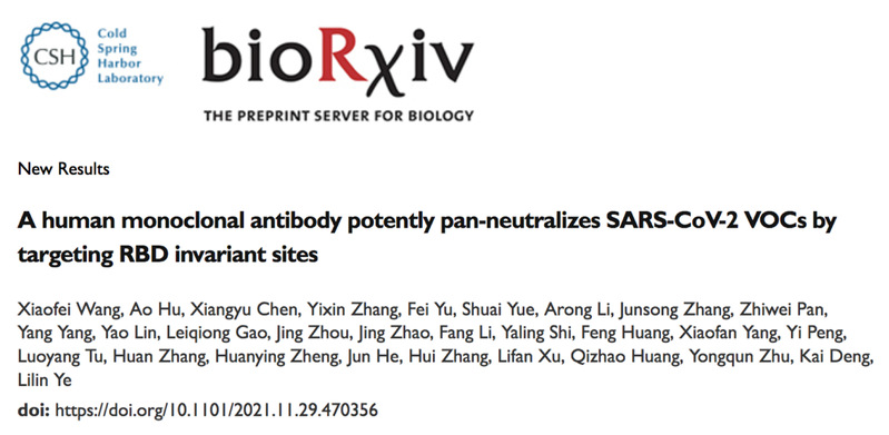 2021年12月01日,浙江大学朱永群团队,联合中山大学邓凯团队、陆军军医大学叶丽林团队在bioRxiv预印版发表了题为“A human monoclonal antibody potently pan-neutralizes SARS-CoV-2 VOCs by targeting RBD invariant sites”的论文,报道了一个高效中和新冠VOCs的全谱人源单克隆抗体,并解析了其独特的作用机制。