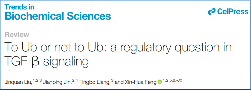202276日,冯新华实验室在Trends in Biochemical Sciences杂志在线发表了题为“To Ub or not to Ub: a regulatory question in TGF-b signaling”的综述论文,全面地阐述了泛素化修饰和类泛素化修饰在转化生长因子b (Transforming Growth Factor-b, TGF-b)信号通路中的关键调控作用