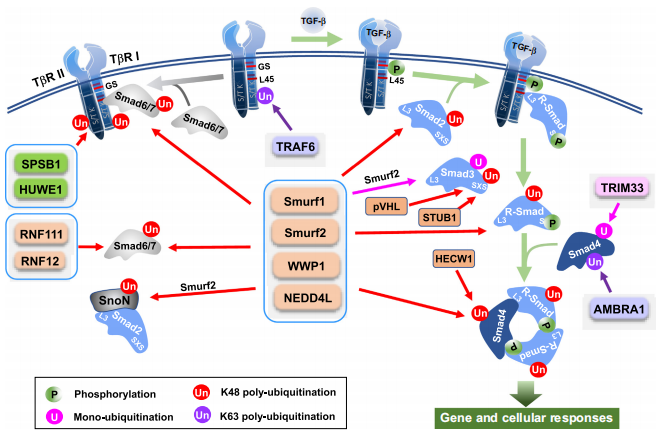TGF-b在细胞增殖、凋亡、分化以及胚胎发育等生理过程中发挥着重要的调控作用。TGF-b信号通路的异常调控可能引发多种疾病,包括胚胎发育异常、免疫性疾病、组织纤维化、心血管疾病和肿瘤等。因此,探究TGF-b信号通路的精准调控对于疾病治疗具有积极意义。过去的研究表明,一系列蛋白质翻译后修饰参与了对于TGF-b信号通路的调控。其中,泛素化修饰和类泛素化修饰在调控TGF-b信号传导中发挥着重要作用。