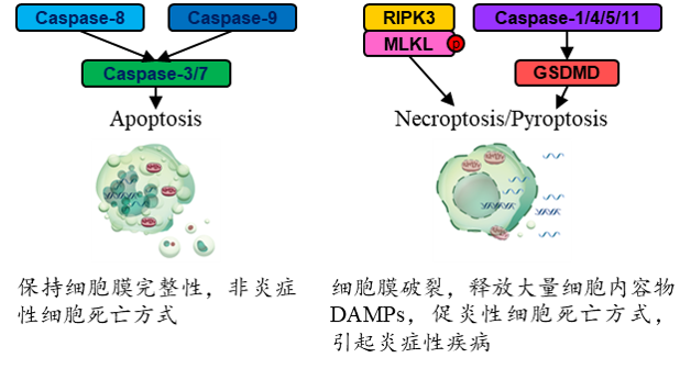 细胞死亡是生命体中普遍存在的生物学过程,在机体的生长发育过程中发挥重要作用,并与多种疾病的发生有关。细胞死亡分为可调控的程序性细胞死亡(programmed cell death)和不受调控的细胞坏死(necrosis)。根据其发生机制不同,程序性细胞死亡分为细胞凋亡(apoptosis)、程序性细胞坏死(necroptosis)和细胞焦亡(pyroptosis)等。细胞凋亡通常被认为是非炎症性的细胞死亡方式,而程序性细胞坏死和细胞焦亡通过引起细胞膜破裂来释放大量细胞内容物损伤相关分子模式(DAMPs),这些分子可以被免疫细胞识别并触发炎症反应。