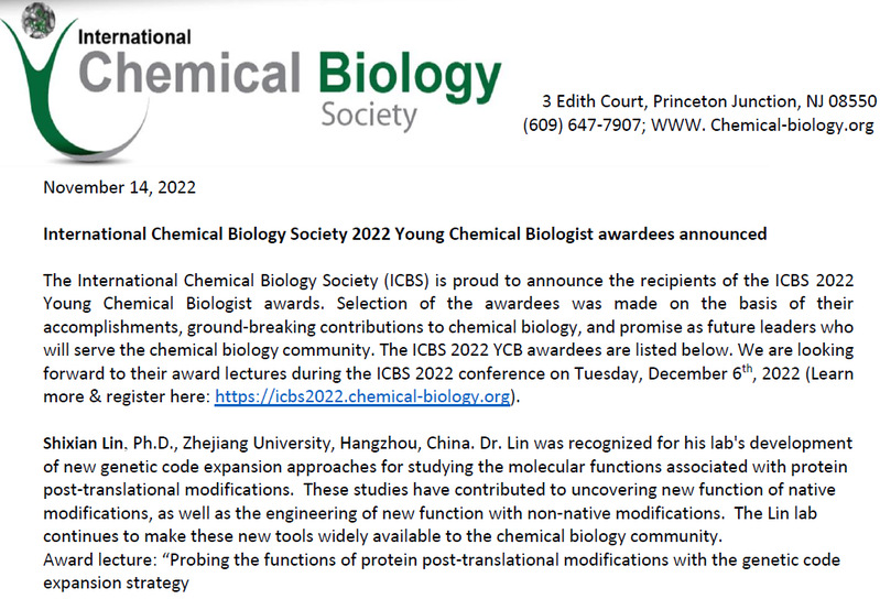 近日,经评委会评审,国际化学生物学协会(International Chemical Biology Society)正式公布了2022年青年化学生物学家奖(Young Chemical Biologist Award),我院林世贤研究员喜获该殊荣。该奖项由国际化学生物学学会设立,旨在鼓励和表彰在化学生物学领域取得优秀独立工作成就的青年科学家(独立工作时间不超过7年)。该奖项每年在全球范围内遴选3位优秀青年化学生物学工作者,今年的获奖人将被邀请在澳大利亚布里斯班举办的国际化学生物学学会的“Rising Stars”分会场做特邀报告,并领取证书和奖金。