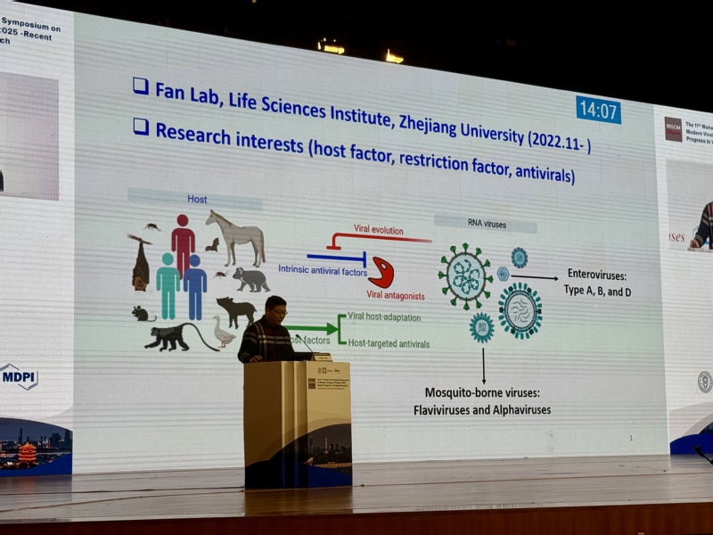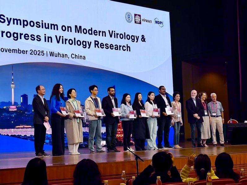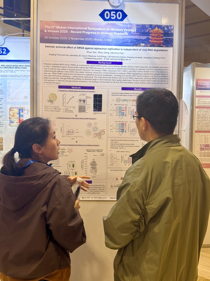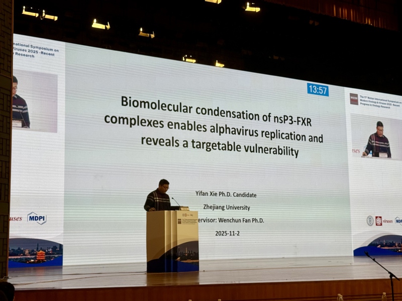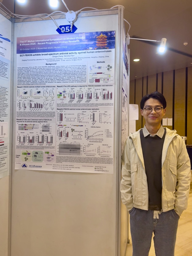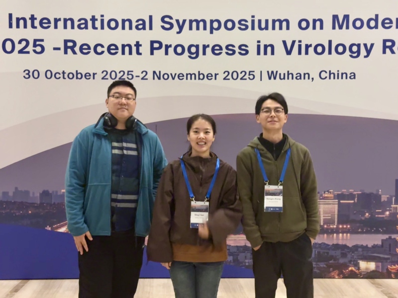 2025年10月          甘淑仪(Poster presentation)、谢逸凡(Selected oral presentation)和张东杰(Poster presentation,获最佳海报奖)同学参加第十一届武汉现代病毒学国际研讨会,武汉 2025.10.31-11.2