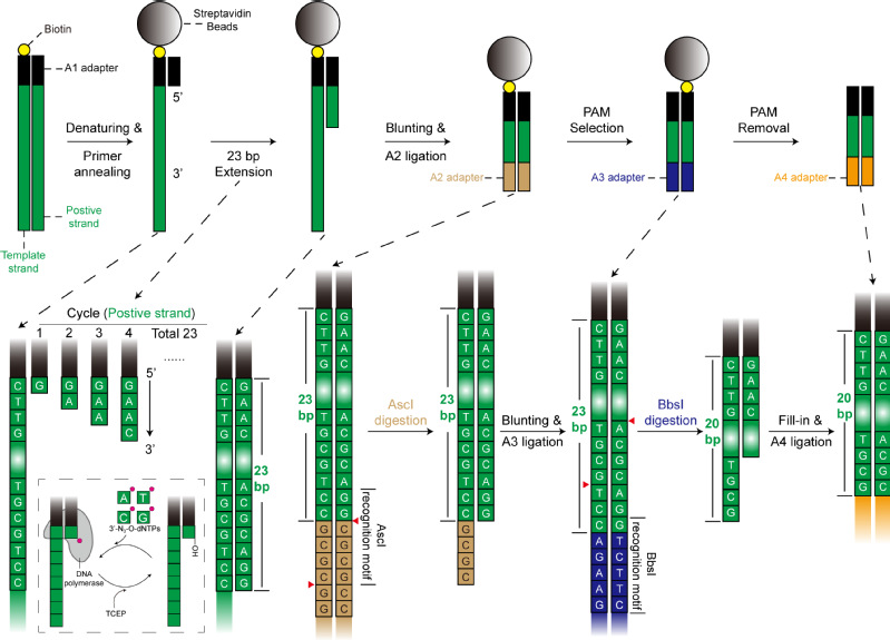 哺乳动物的基因组由数亿个碱基对组成,其中非编码区域约占据百分之99。在CRISPR-Cas9技术问世之前,对这些区域的功能进行注释一直是生命科学领域的难题。随着CRISPR-Cas9技术的出现,基因组序列编辑变得更加精准和便捷。然而,由于整个基因组序列的庞大,使用饱和突变筛选方法对非编码基因组进行注释时需要合成大量的文库。因此,开发高效低成本的gRNA文库合成方法对促进基因组注释的发展至关重要。本团队开发的CTDE方法是一套依赖于可逆终止子系统的合成技术,该技术可利用感兴趣的DNA文库作为模板,合成出整个gRNA文库。CTDE合成出的文库长度统一,且忠实于模板DNA,这为非模式生物或有突变的基因组进行筛选铺平了道路。