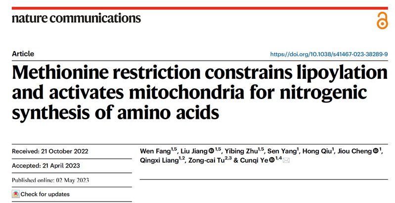 2023年5月2日叶存奇实验室在Nature Commun发文揭示线粒体感受及响应蛋氨酸限制的机制